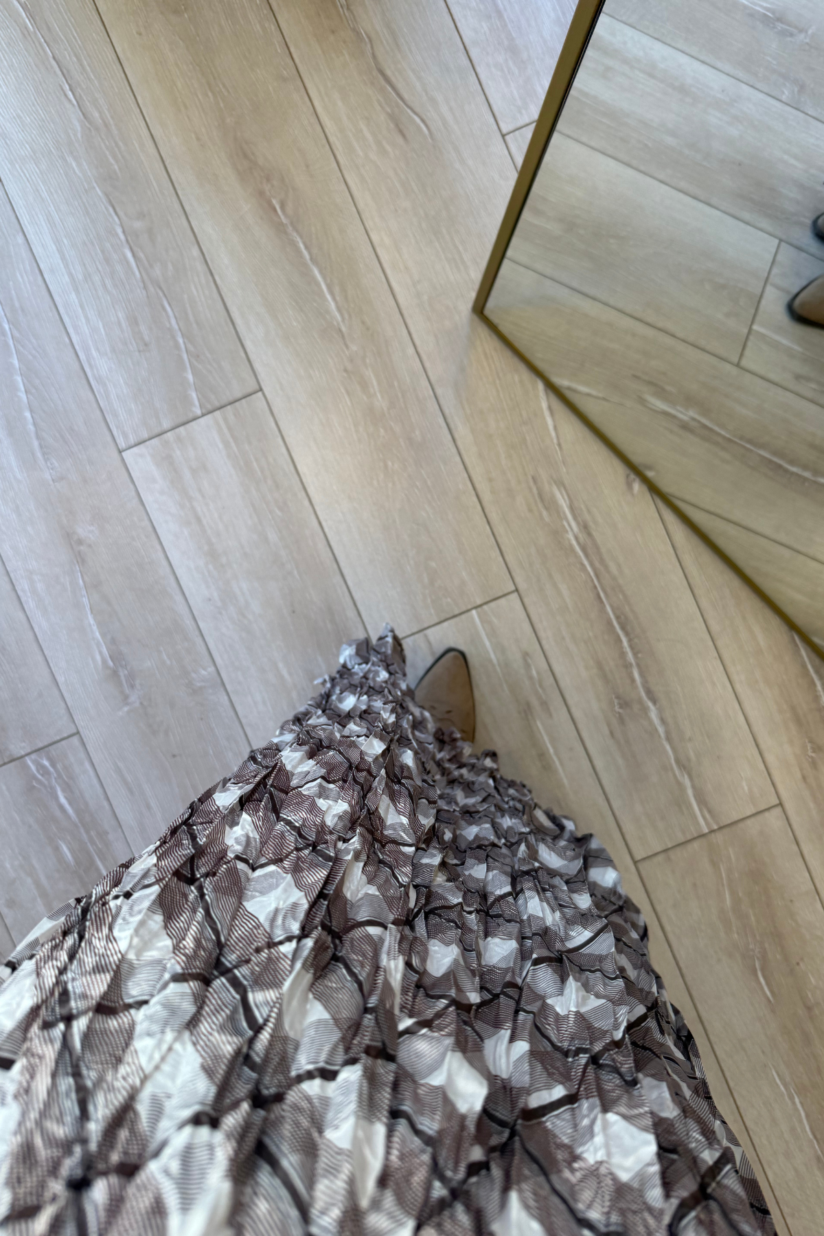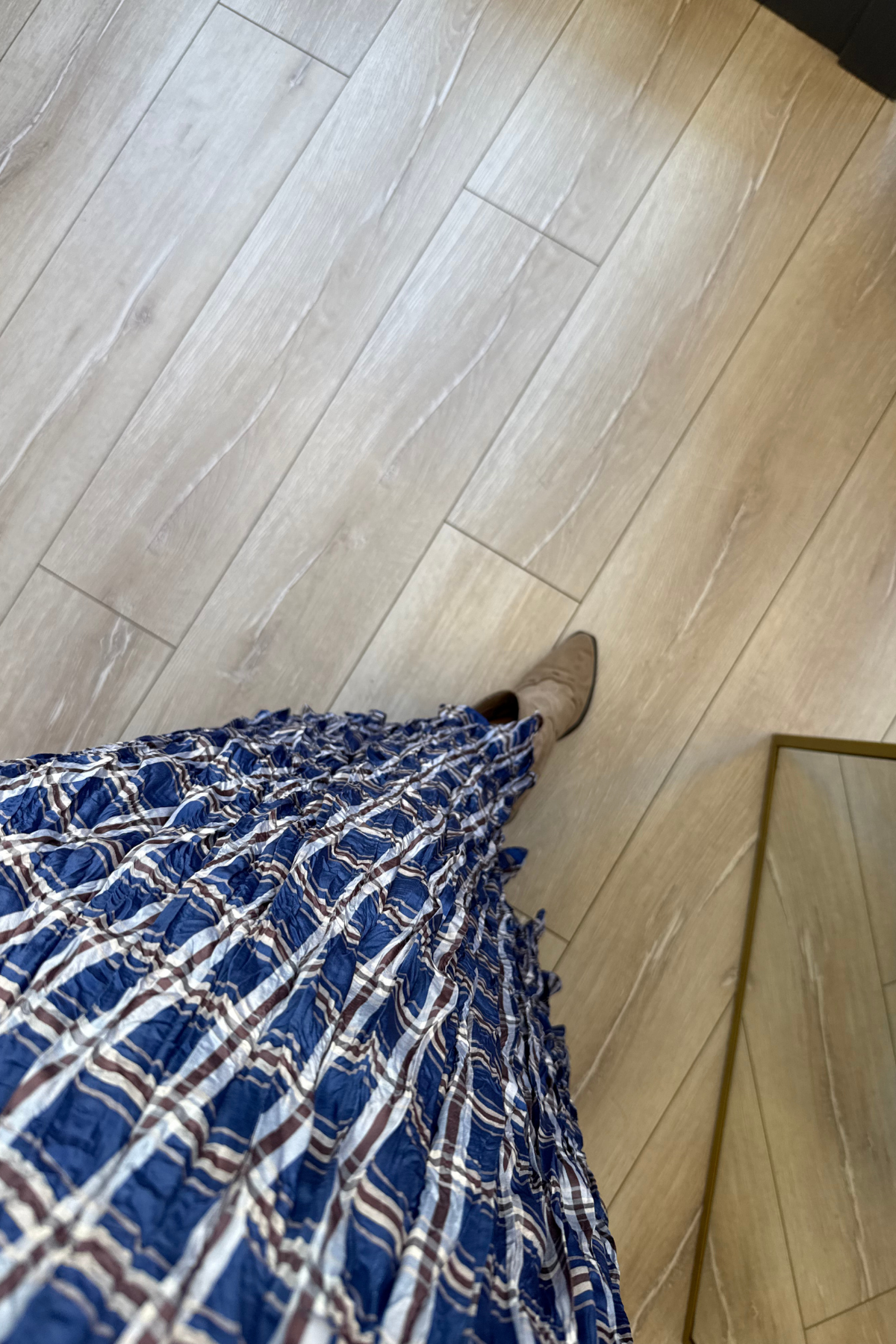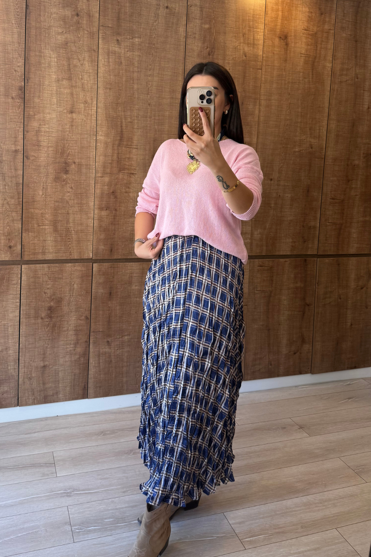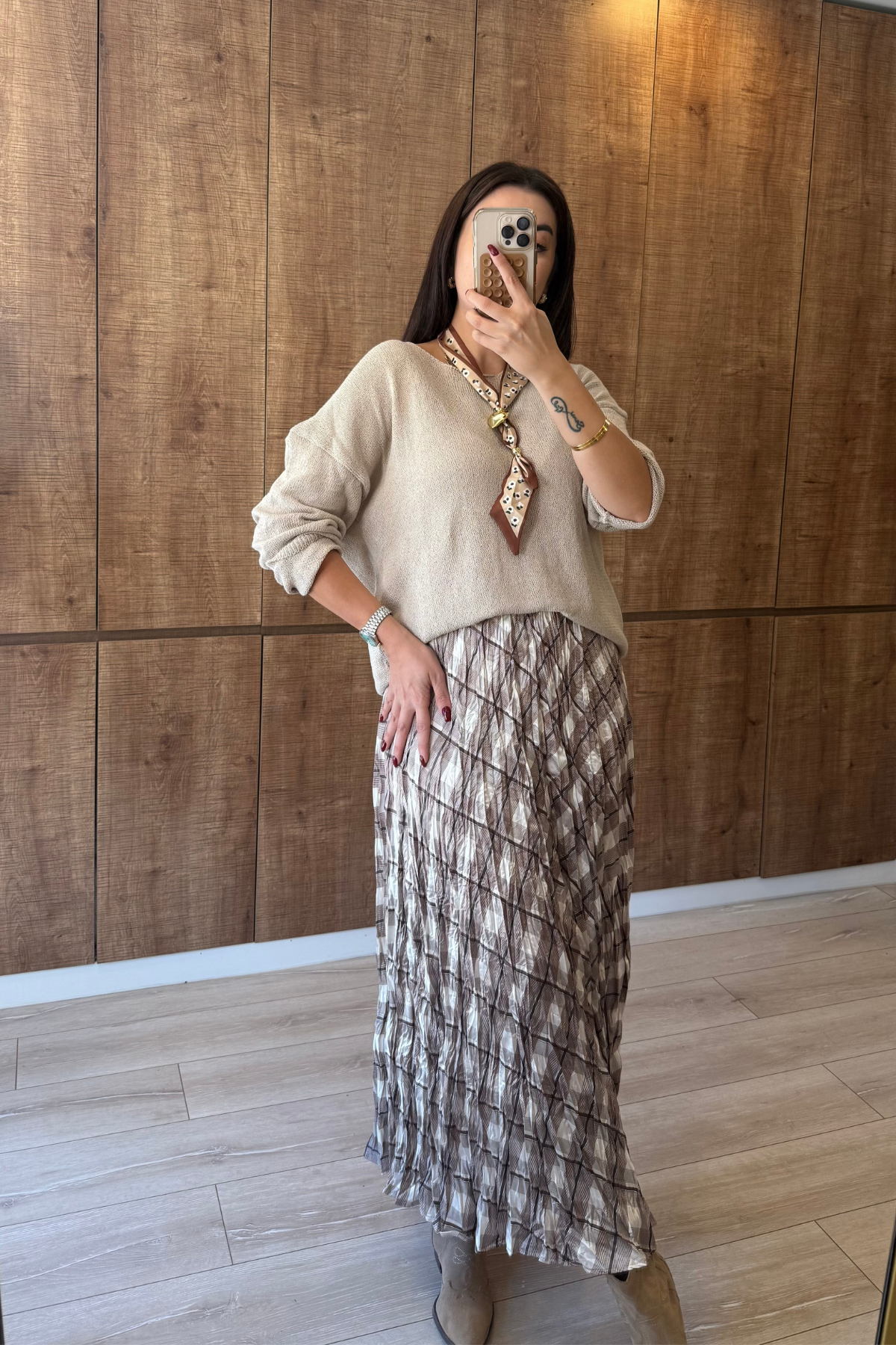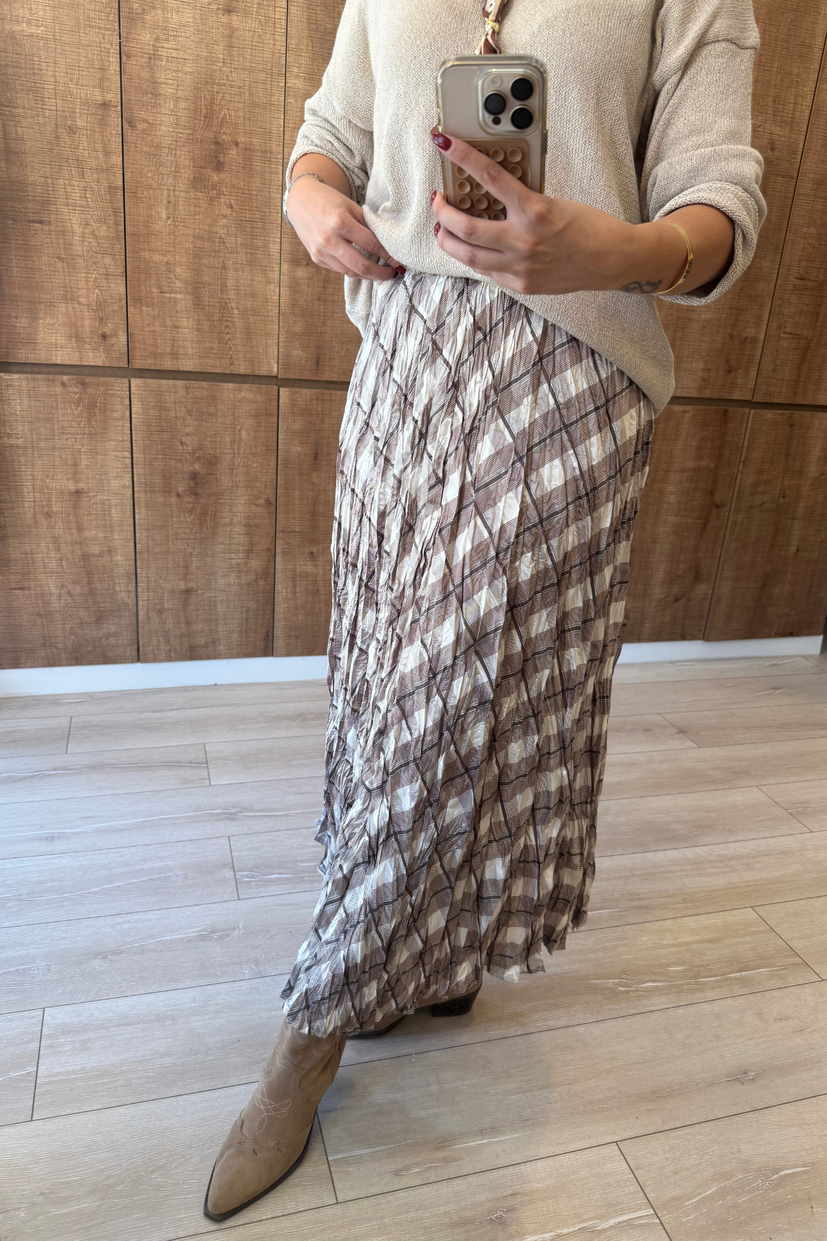 Kraşlı saten kareli desen beli lastikli midi boy etek
